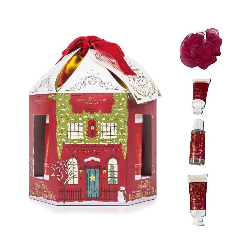 Confezione regalo casetta rossa contenente: crema mani, crema corpo, bagnoschiuma e spugna corpo.