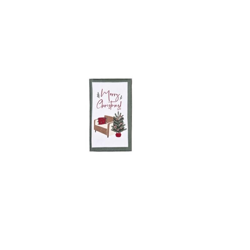 Strofinaccio in spugna di cotone con decoro divano e albero.