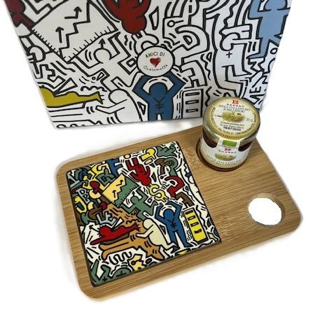 Tagliere in legno con decoro in ceramica e miele coordinato.