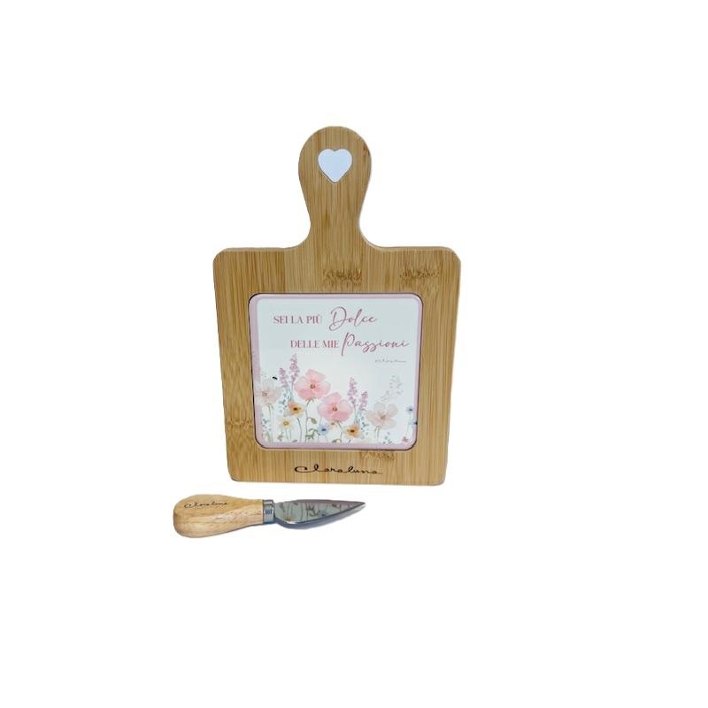 Tagliere in legno bamboo con applicazione in ceramica decorata con fantasia floreale rosa, compreso di coltellino per il formaggio. Dimensioni 23x15x1.5cm. Linea Bomboniere Claraluna.Comprensiva discatola. Per quantità superiori ad 1 pezzo contattare il punto vendita via mail all'indirizzo laculladelleidee@gmail.com o telefonicamente al n.+39 345 9452117