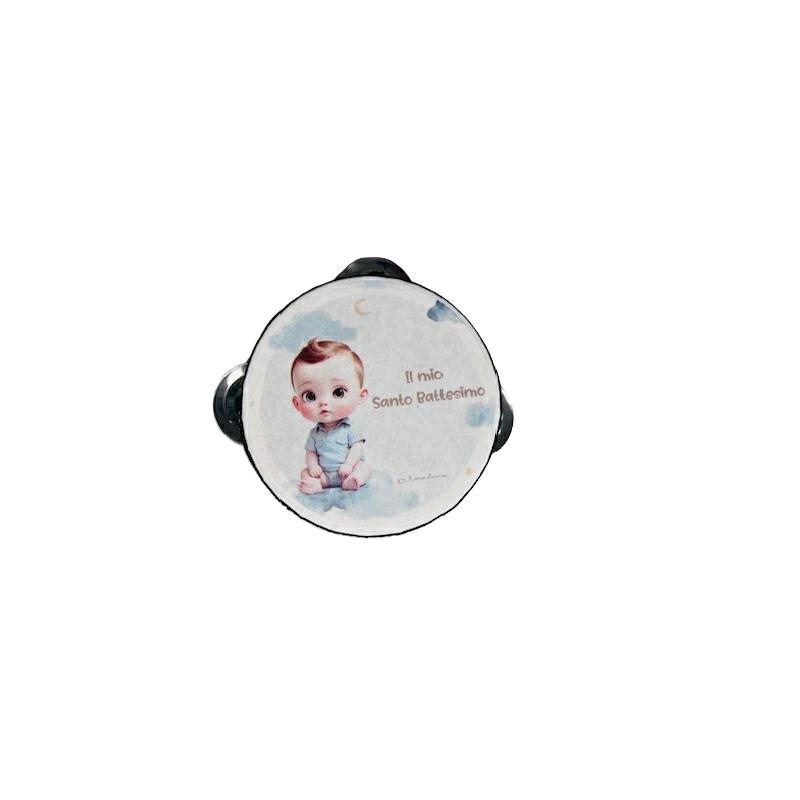 Tamburello in legno con decorazione per battesimo bimbo con possibilità di personalizzazione. Dimensioni 10.2x4.2cm. Linea Bomboniere Claraluna.Comprensiva di scatola. Per quantità superiori ad 1 pezzo e per la personalizzazione contattare il punto vendita via mail all'indirizzo laculladelleidee@gmail.com o telefonicamente al n.+39 345 9452117
