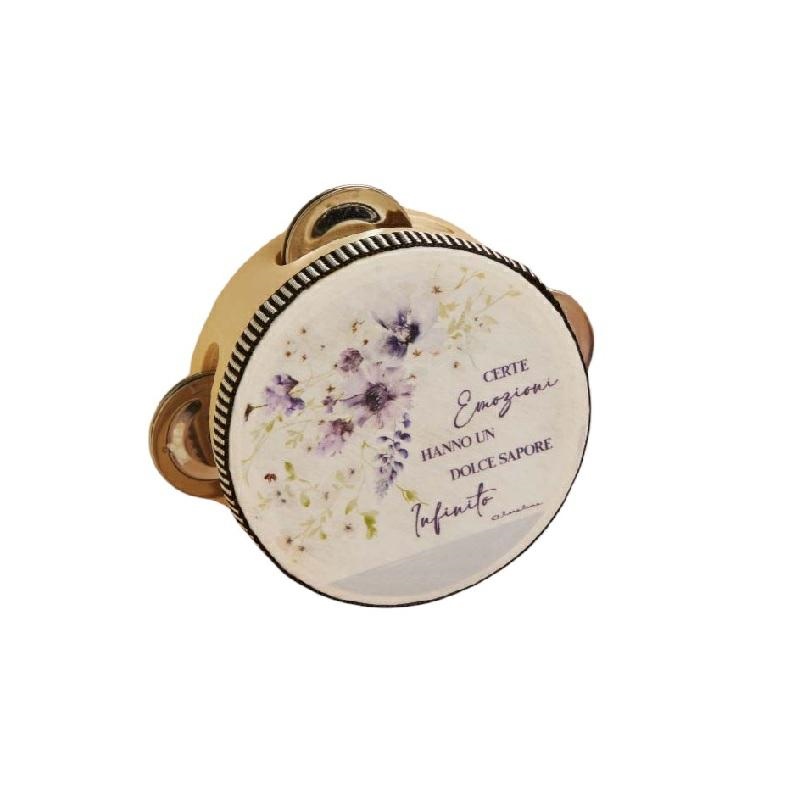 Tamburello in legno con decorazione fantasia floreale lilla e scritta "Certe emozioni hanno un dolce sapore infinito" con possibilità di personalizzazione. Dimensioni 10.2x4.2cm. Linea Bomboniere Claraluna.Comprensiva di scatola. Per quantità superiori ad 1 pezzo e per la personalizzazione contattare il punto vendita via mail all'indirizzo laculladelleidee@gmail.com o telefonicamente al n.+39 345 9452117