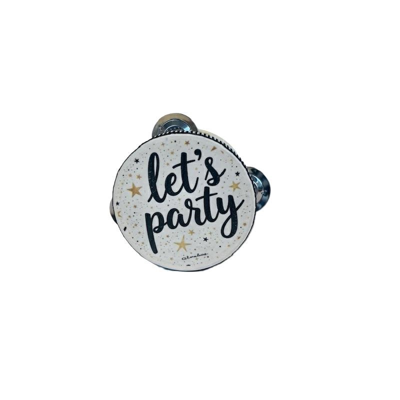 Tamburello in legno con decoro davanti Let's Party. Dimensioni 10.2x4.2 cm. Linea Bomboniere Claraluna. Per quantità superiori ad 1 pezzo contattare il punto vendita via mail all'indirizzo laculladelleidee@gmail.com o telefonicamente al n.+39 345 9452117