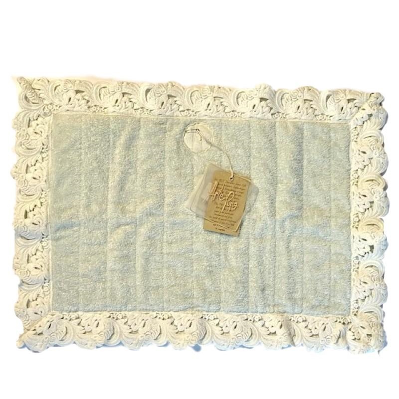 Tappeto in spugna di cotone con applicazione del pizzo Armonia sul bordo.