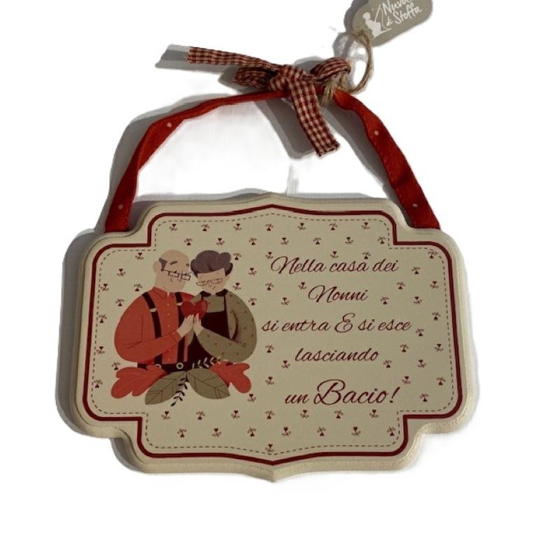 Targhetta in legno con laccetto per appenderla, decorazione con dedica "Nella casa dei Nonni si entra e si esce lasciando un Bacio!".