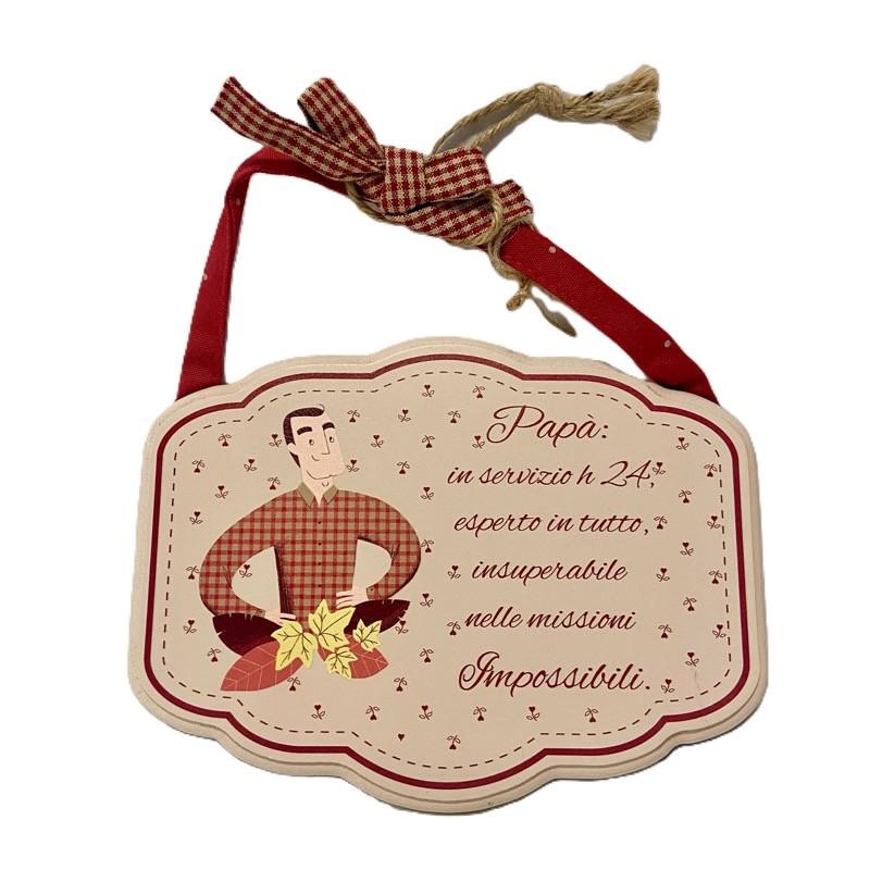 Targhetta in legno con laccetto per appenderla, decorazione con dedica "Papà: in servizio h 24, esperto in tutto, insuperabile nelle missioni impossibili".