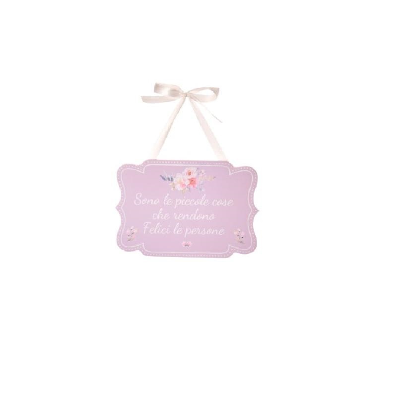 Targhetta decorativa in legno color lilla vivace, con nastrino e frase, modello A: "Sono le piccole cose che rendono felici le persone".