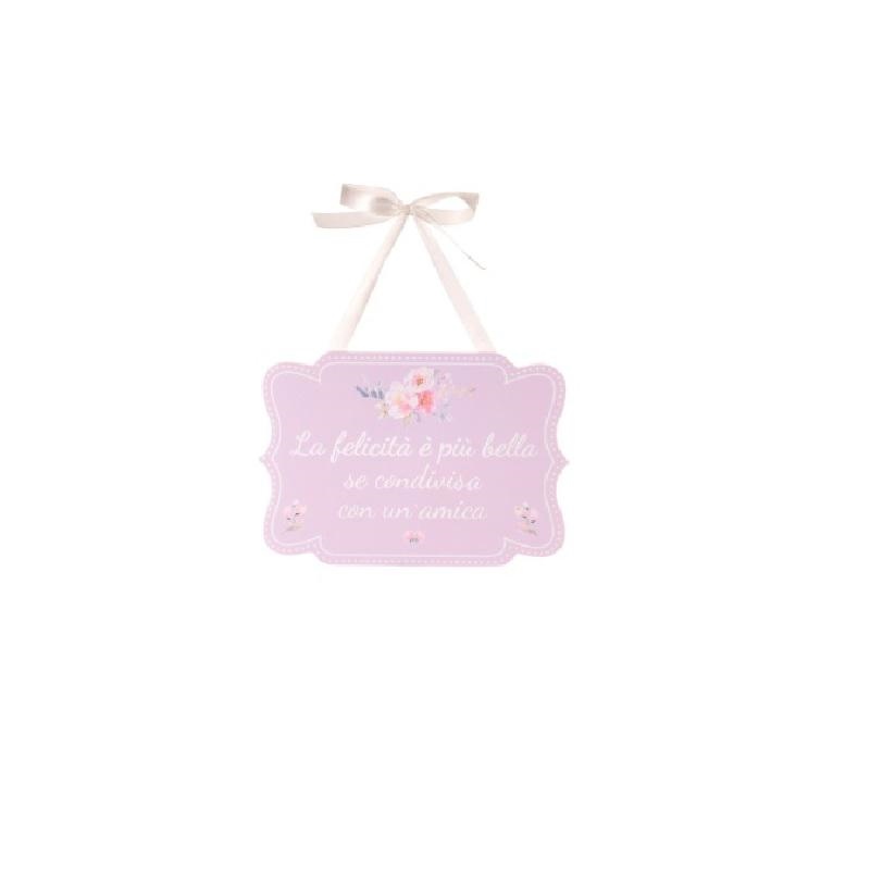 Targhetta decorativa in legno color lilla vivace, con nastrino e frase, modello B: "La felicità è più bella se condivisa con un'amica".