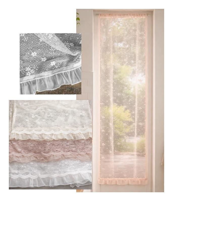 Coppia di tendine in pizzo e rouches con laccetti color malva.