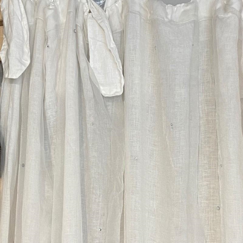 Tenda in lino leggero, organza e cristalli. Allacciatura con laccetti. E' adatta per una camera da letto o un soggiorno. Il lino è un materiale naturale e non si stira. La sua semplicità dona un accento moderno all'ambiente che viene impreziosito dall'organza leggera e dalla luce dei cristalli. L'organza esprime un senso di libertà e la luce dei cristalli dona quel tocco di eleganza e regalitàalla casa. Dimensioni 130x300cm. Colore Bianco.