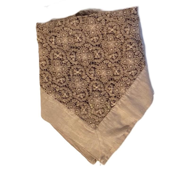 Tovaglia quadrata ideale come centrotavola, tutta decorata in pizzo uncinetto con bordo in lino.