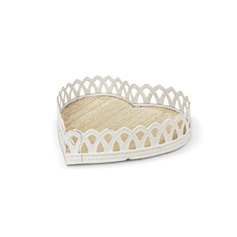 Vassoietto in legno con bordo in metallo bianco a forma di cuore.