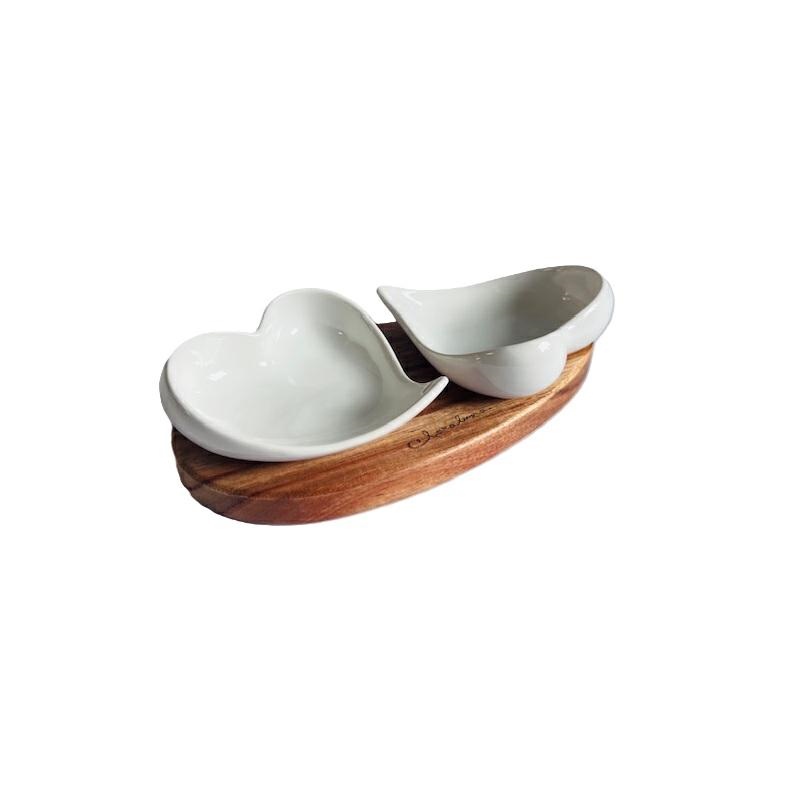 Vassoio in legno acacia con 2 ciotole in poercellana bianca a forma di cuore. Dimensioni vassoio 19x10x1cm, cuore 9x8.5x3x3.5 cm. Linea Bomboniere Claraluna.Comprensiva di scatola. Per quantità superiori ad 1 pezzo contattare il punto vendita via mail all'indirizzo laculladelleidee@gmail.com o telefonicamente al n.+39 345 9452117