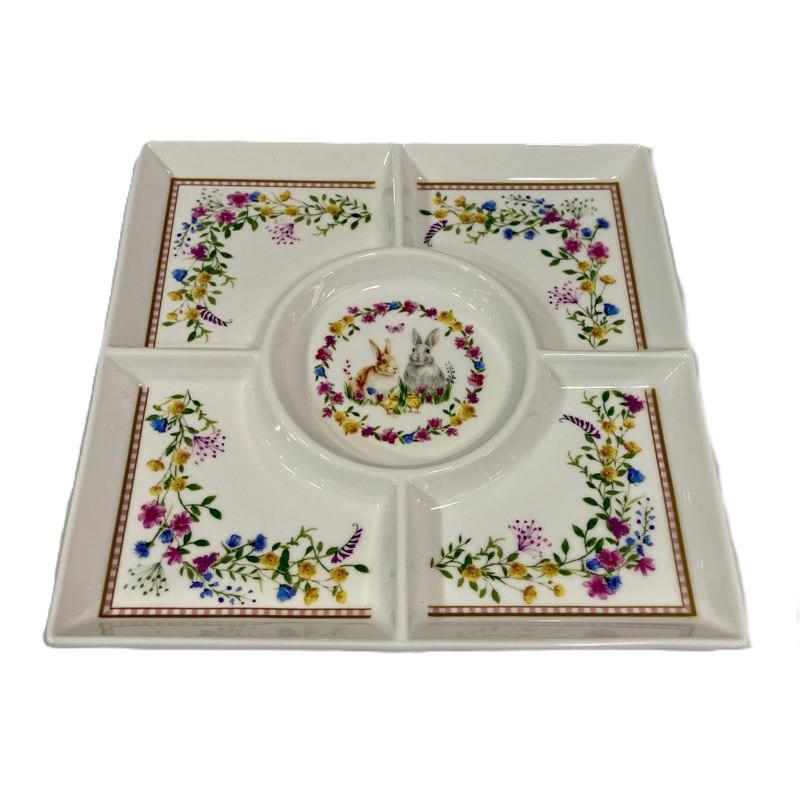 Piatto da Aperitivo Pasquale con coniglietti, pulcini e decori floreali lungo il bordo. Realizzato in porcellana con cinque scomparti separati per le varie pietanze. Dimensioni 25 x 25 cm scatola abbinata rigida. Perfetto da utilizzare durate le feste di Pasqua per gioire con un buon aperitivo. Adatto per la lavastoviglie e microonde.