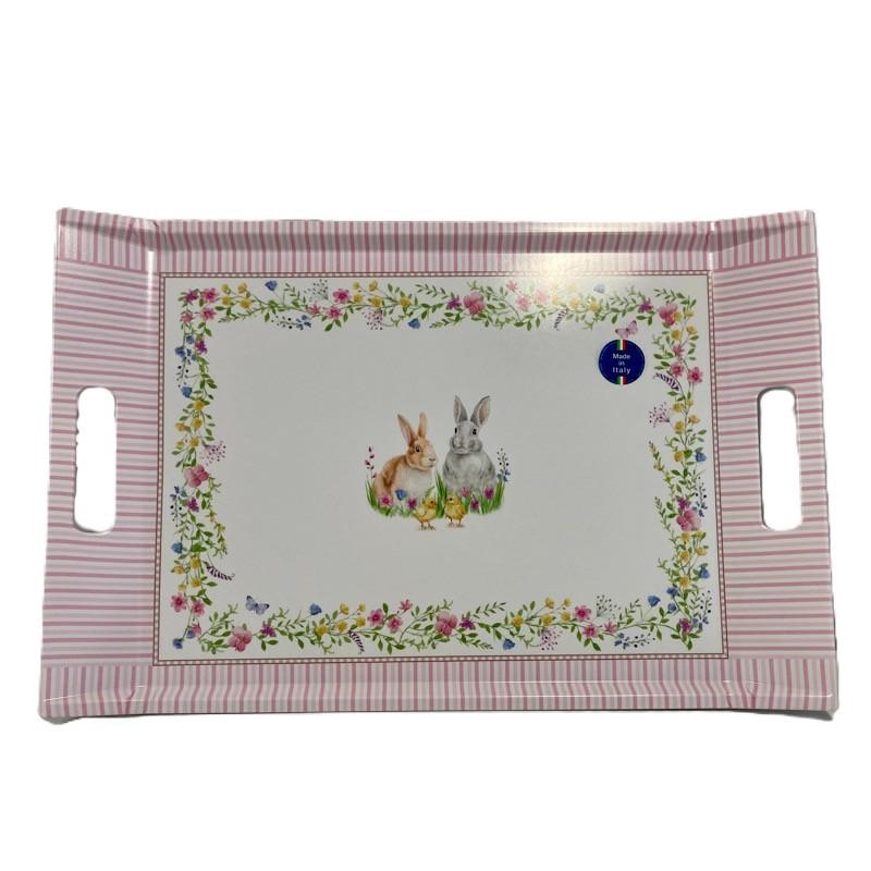 Vassoio Pasquale con coniglietti, pulcini e decori floreali lungo il bordo e con strisce rosa e bianche.