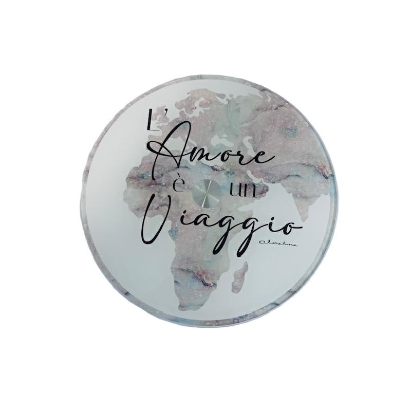Vassoio girevole in vetro con decorazione mondo e scritta "L'Amore è un viaggio". Dimensioni circa 25x0.4cm. Linea Bomboniere Claraluna.Comprensiva di scatola. Per quantità superiori ad 1 pezzo contattare il punto vendita via mail all'indirizzo laculladelleidee@gmail.com o telefonicamente al n.+39 345 9452117