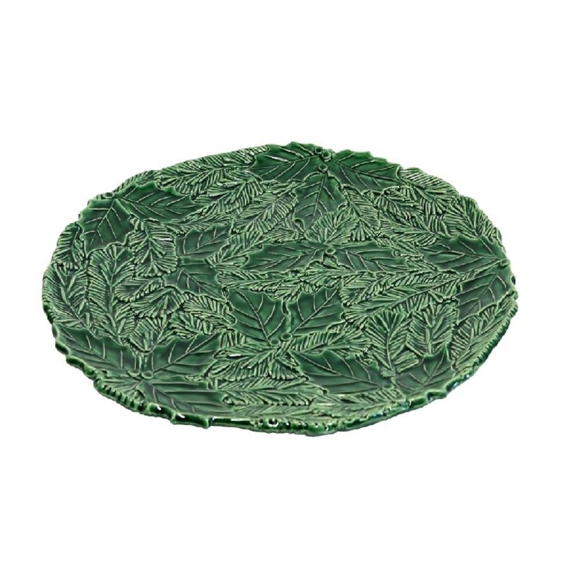 Vassoio in ceramica artigianale con decorazione aghi e agrifoglio in rilievo.