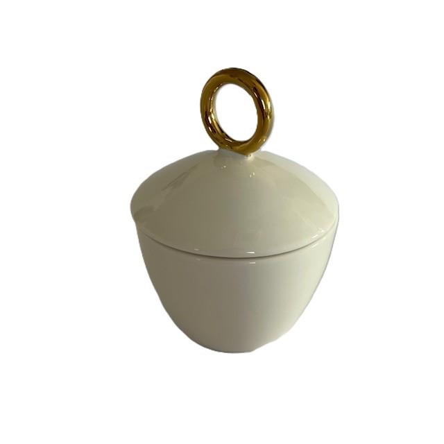 Zuccheriera con coperchio in porcellana bianca con bordo oro.